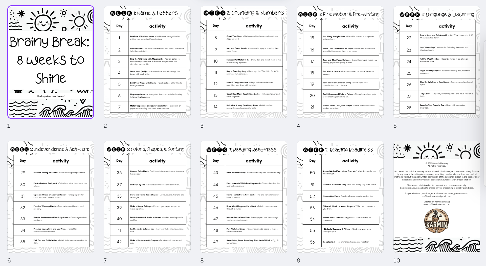 Help your little one feel confident and excited for kindergarten with this teacher-created activity pack! Brainy Break: 8 Weeks to shine is filled with 8 weeks of fun, simple, and skill-building activities designed to keep young learners engaged—all without the pressure.