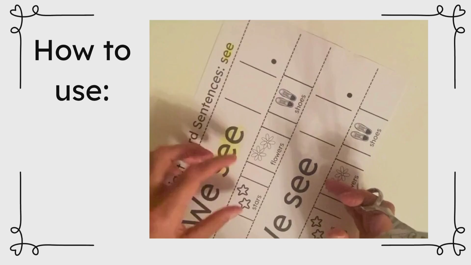 Students slide pictures through sentence frames to complete sentences, using visual cues for non-sight words while focusing on sight word mastery.