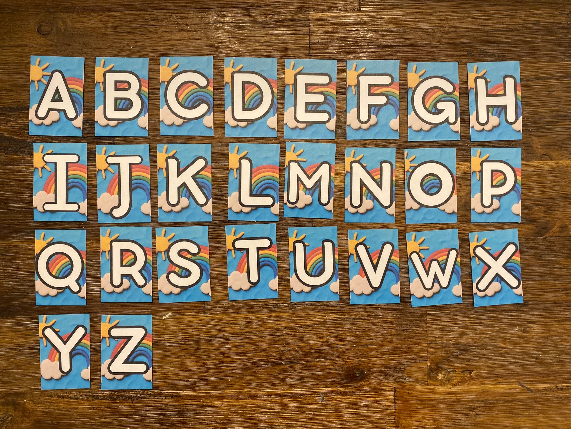 Make learning the ABCs hands-on, colorful, and fun with this complete set of uppercase alphabet magnets! Each letter is printed on a 2x3” laminated magnet featuring a cheerful rainbow, sunshine, and cloud background — perfect for little learners.